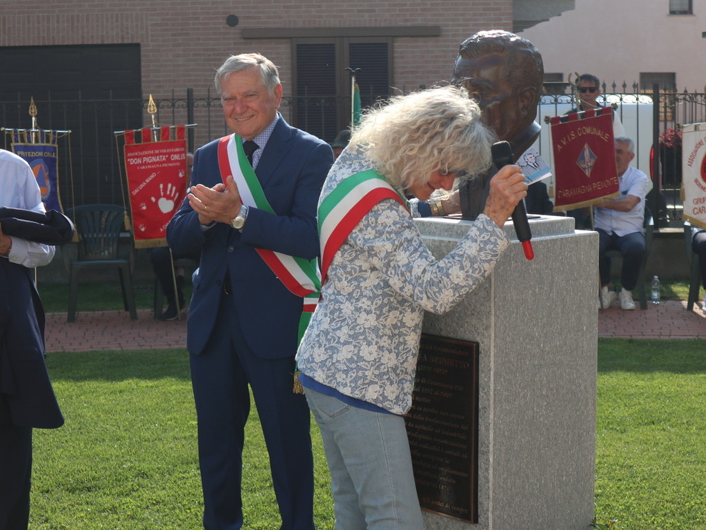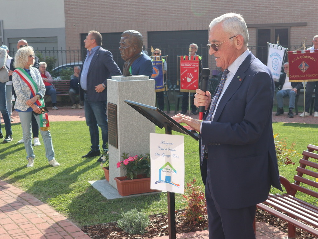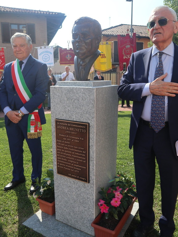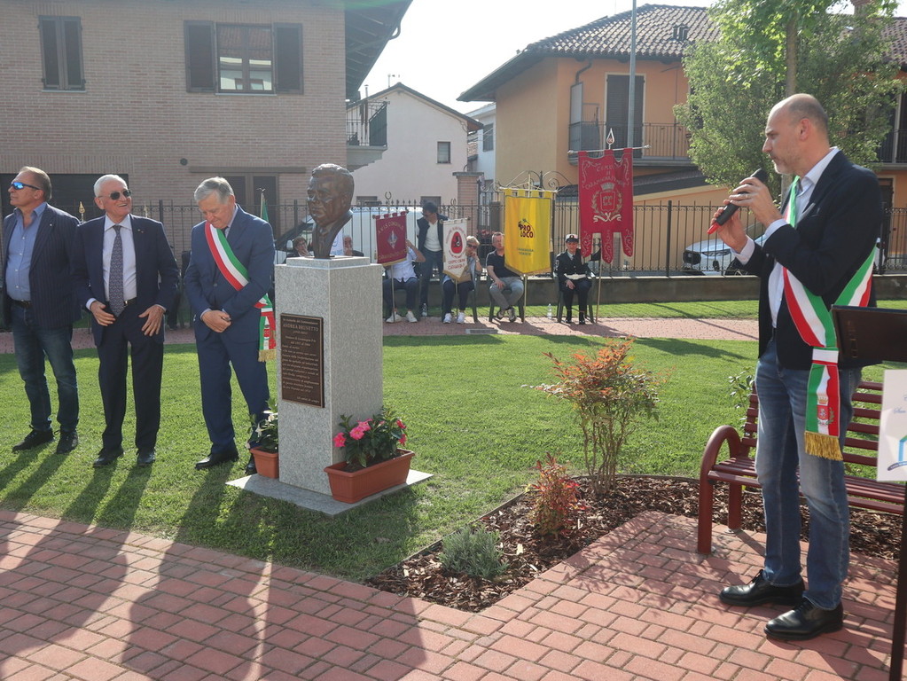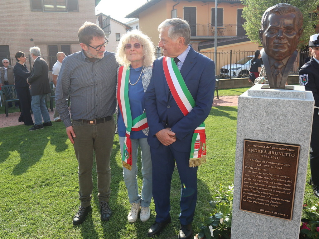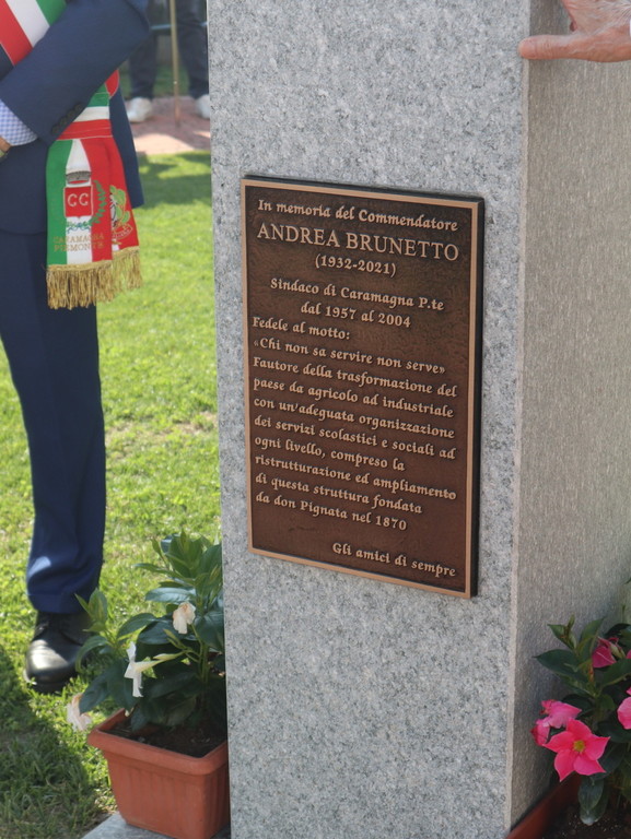 Dopo la scopertura in piazza Castello della targa commemorativa presso “Casa Brunetto”, il corteo si è recato nel giardino della Casa di Riposo San Giuseppe (guidata del presidente Luigi Bono, anche presente nella cerimonia a suo ricordo). Proprio l’rsa fu rinnovata negli ultimi anni di vita nei suoi ambienti, grazie all’opera di Brunetto. Qui si trova anche l’attuale area verde, ove è stato svelato e benedetto (con il rito da parte di don Mario Mana) il busto di bronzo realizzato dall’abile scultore e ritrattista di origini siciliane, che risiede in Liguria, Pietro Marchese, con un lavoro certosino iniziato nel 2021, a stretto confronto con coloro i quali conoscevano espressione della fisionomia ed erano depositarie di immagini storiche dello stesso ex primo cittadino.