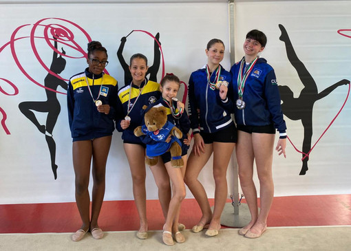 Le ginnaste dell'Auxilium Cuneo hanno ben figurato facendo il pieno di medaglie sia nelle prove individuali che collettive, ben supportate dal team allenatori e dal tifo dei genitori.