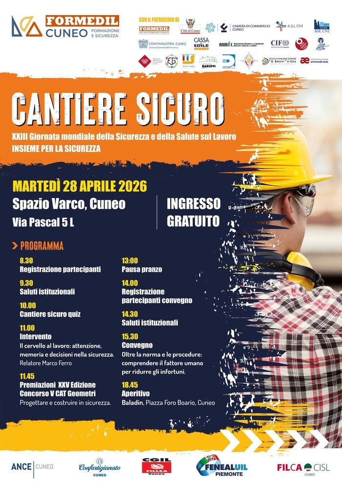 Si svolgerà martedì 28 aprile a Cuneo, in occasione della XXIII 'Giornata Mondiale della Sicurezza e della Salute sul Lavoro', un articolato evento organizzato da Formedil Cuneo, presso lo Spazio Varco di via Pascal 5L.