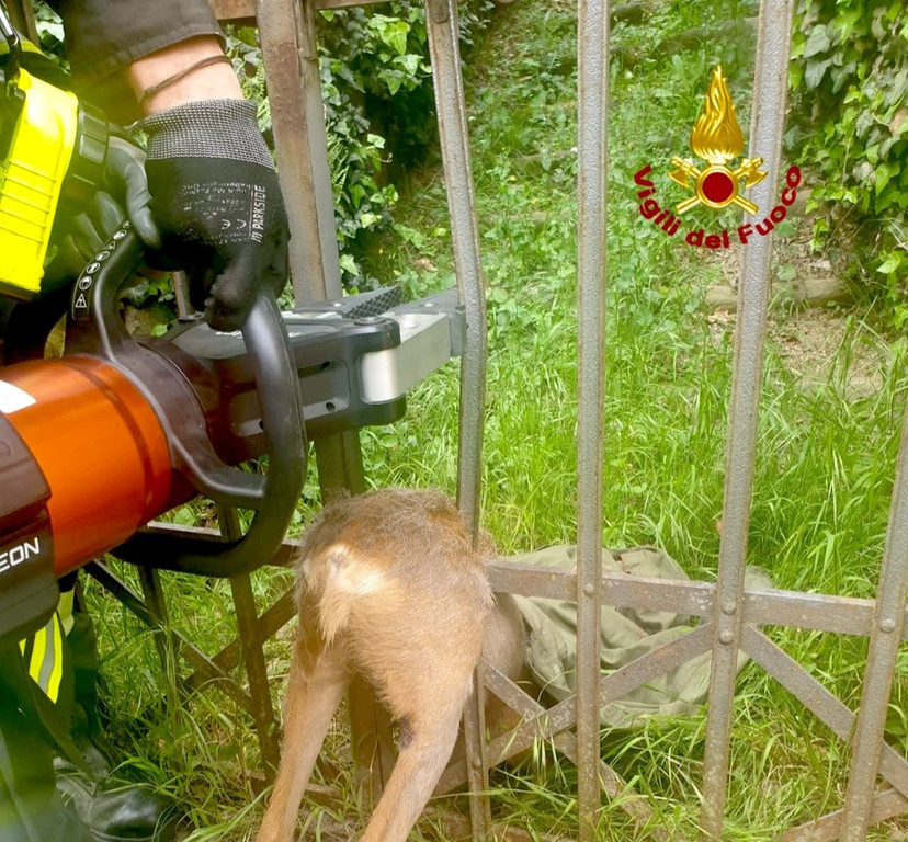 Capriolo incastrato in un cancello a Roccabruna: intervengono i Vigili del Fuoco