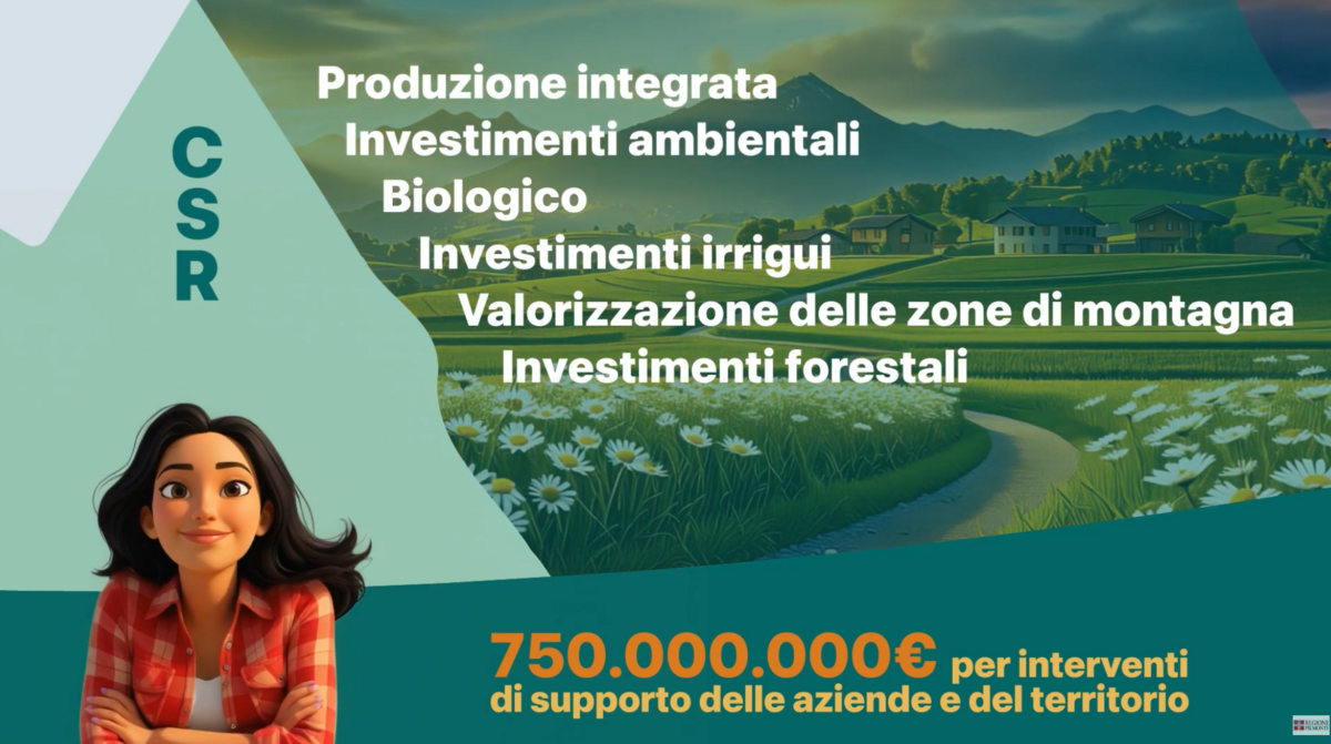 Spiegano il presidente della Regione Piemonte Alberto Cirio e l’assessore al Commercio, Agricoltura e Cibo, Turismo, Sport e Post-olimpico, Caccia e Pesca, Parchi Paolo Bongioanni: «Innovazione e ricerca, ingresso dei giovani in agricoltura e ricambio generazionale, promozione della filiera corta, diversificazione e sviluppo sociale delle zone rurali, buone pratiche e crescita della sostenibilità, benessere animale, conservazione dell’agro-biodiversità. Sono tantissimi e importanti i fronti per cui il Csr con la sua dotazione di 750 milioni di euro rappresenta un formidabile motore di cambiamento. Fanno parte della nostra vita quotidiana senza che neanche ce ne accorgiamo. Raccontare in modo pop con un video semplice ma preciso il sostegno alla nostra agricoltura è un modo per spiegare un impegno complesso e dietro le quinte, ma senza il quale il successo crescente dell’agroalimentare piemontese non sarebbe possibile».